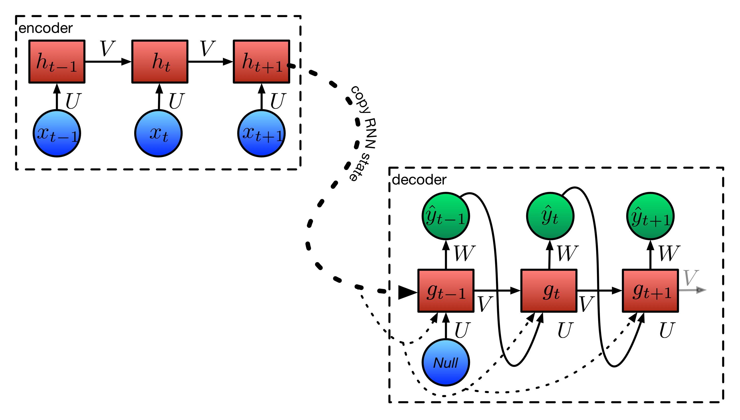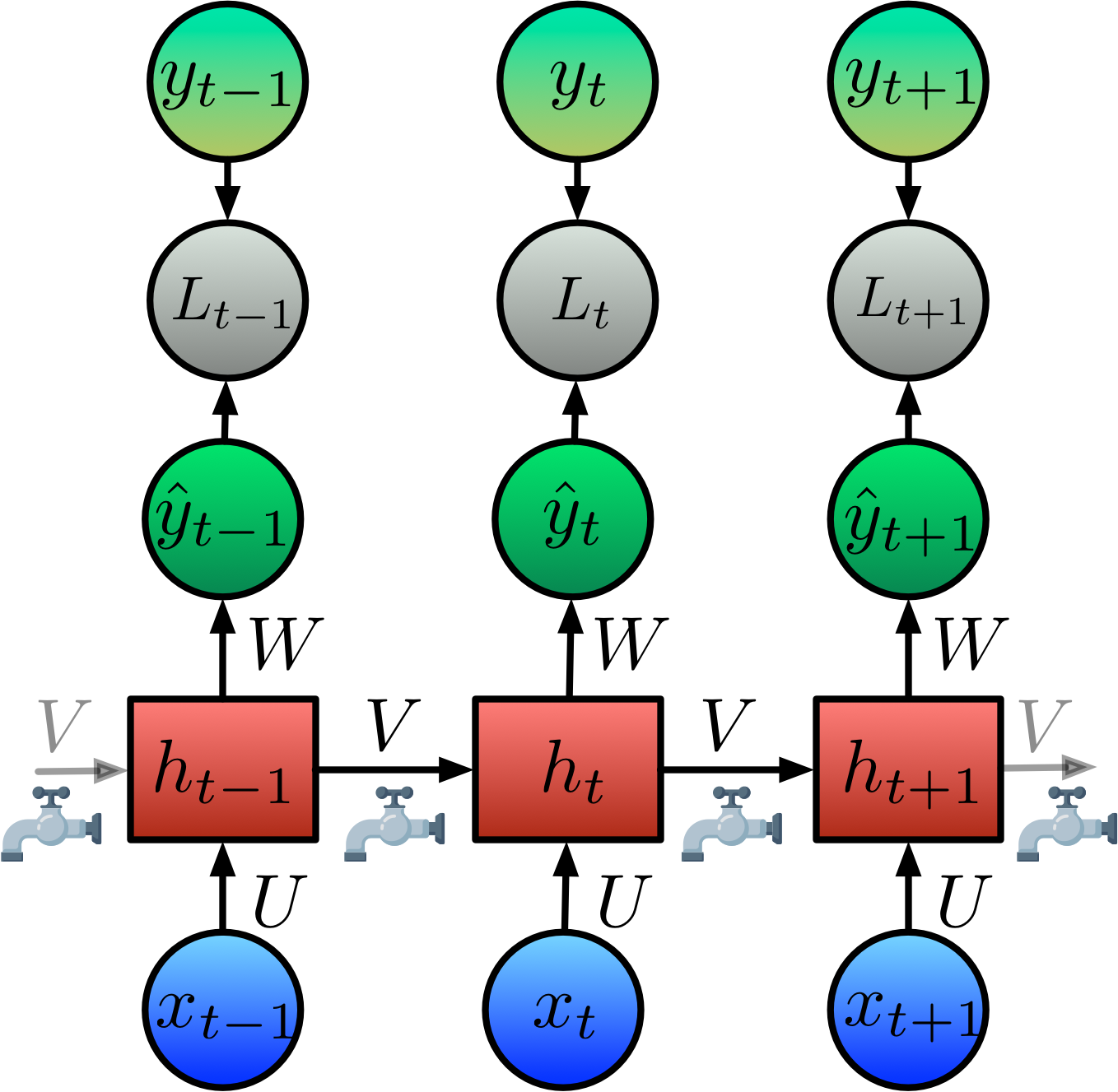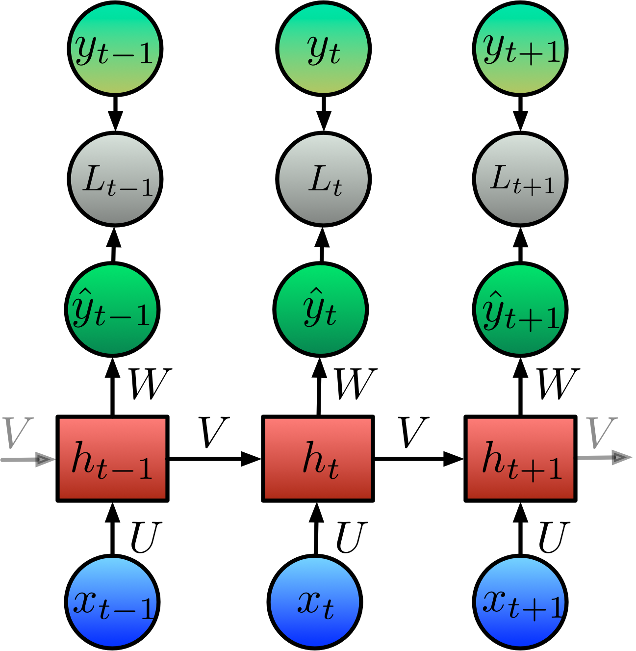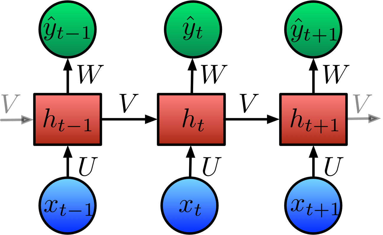 - Note that the weight matrices \(U\), \(V\), \(W\) are the same for each timestep; this is the big advantage of RNNs!