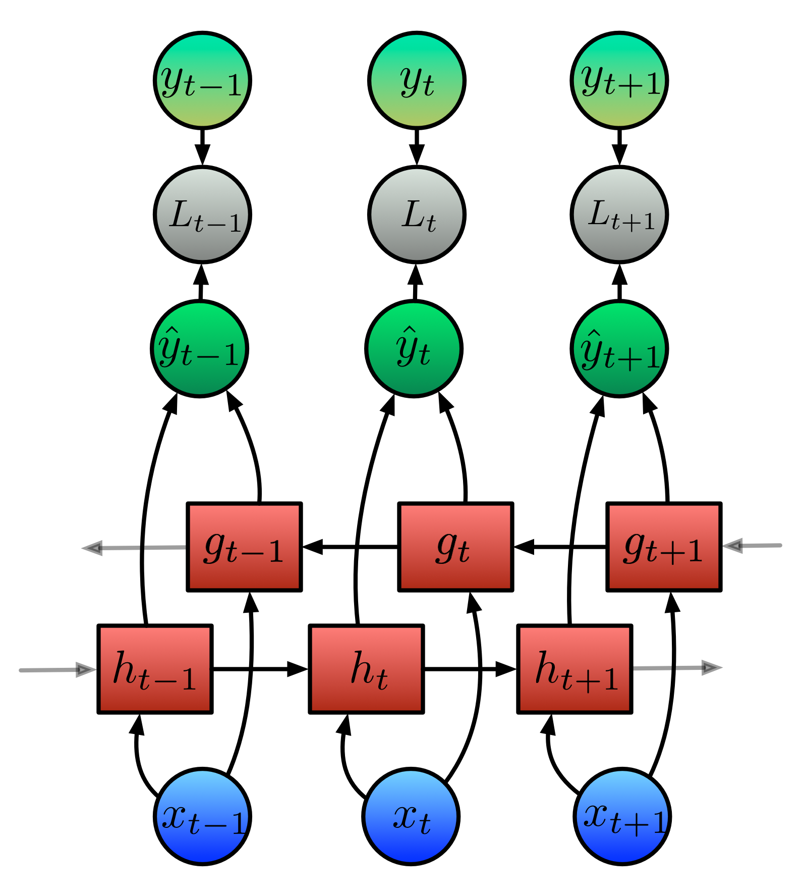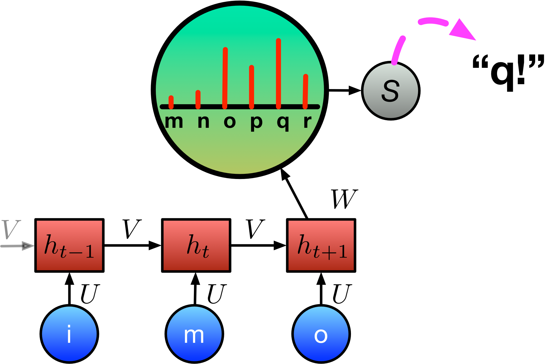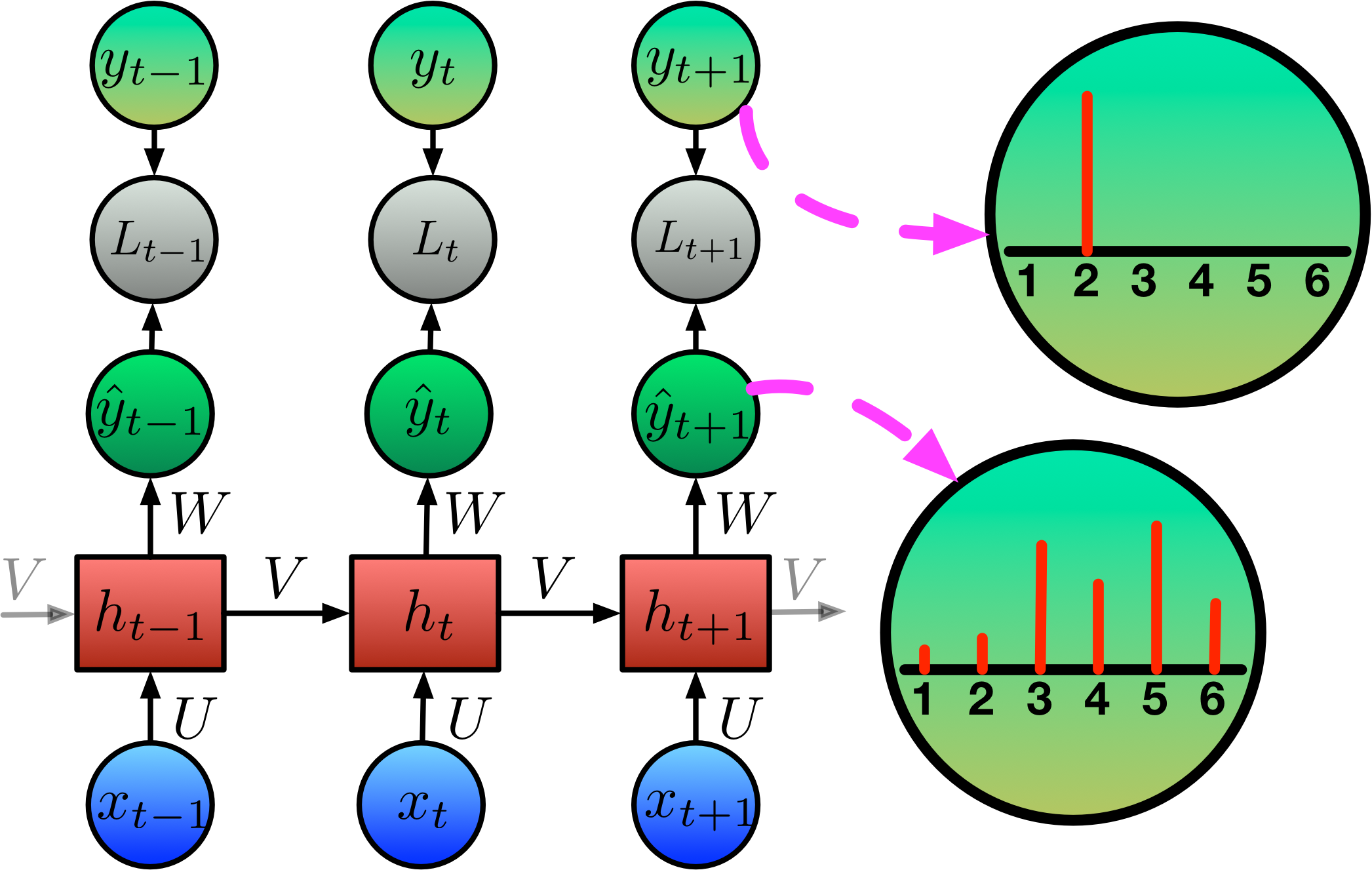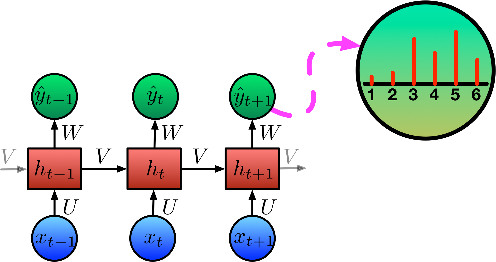 \[\hat{y}_t = \text{softmax}(c + Wh_t)\]