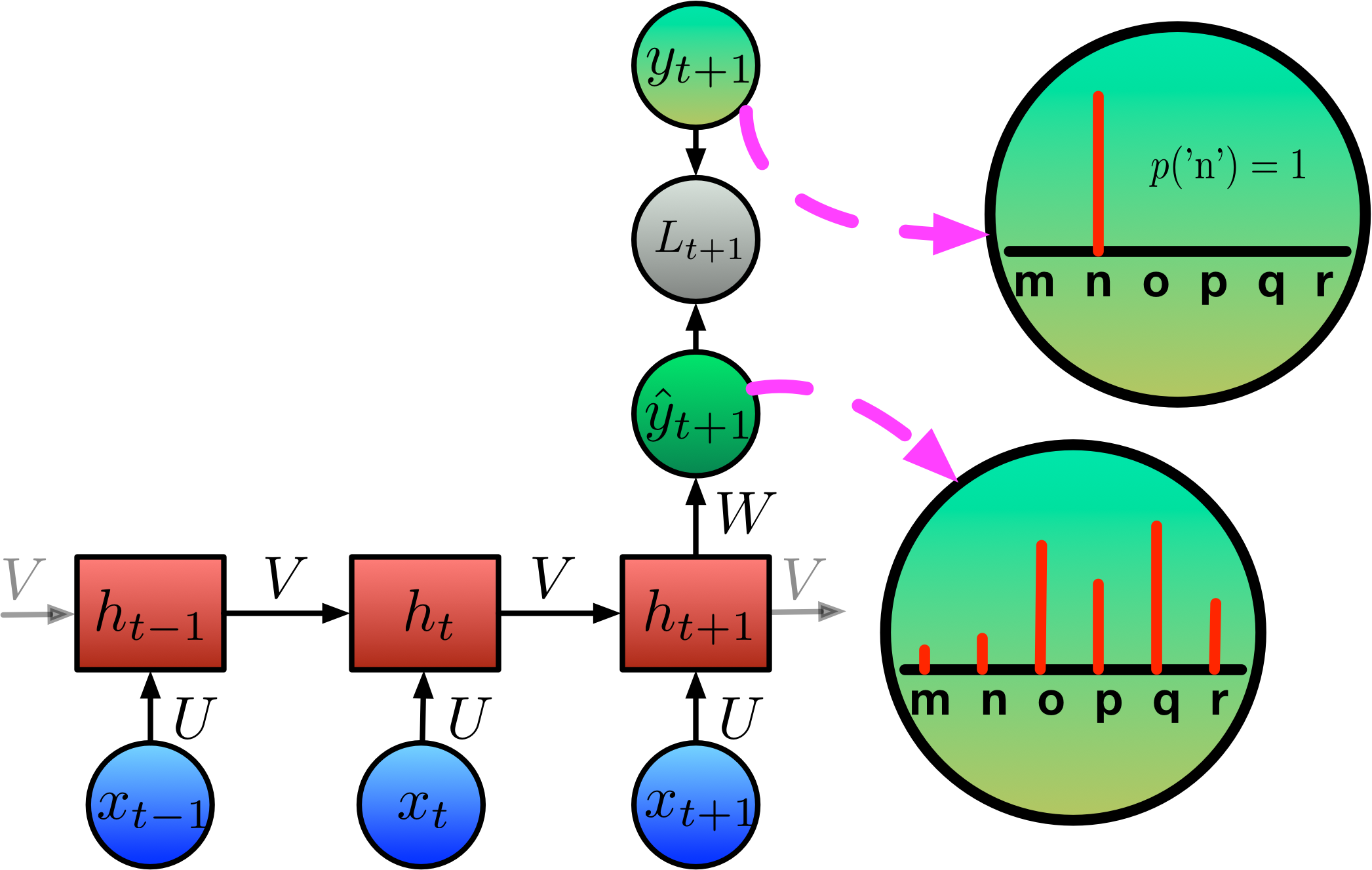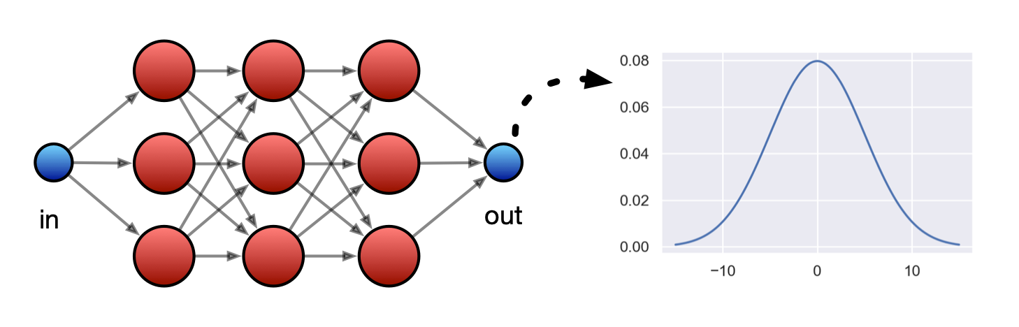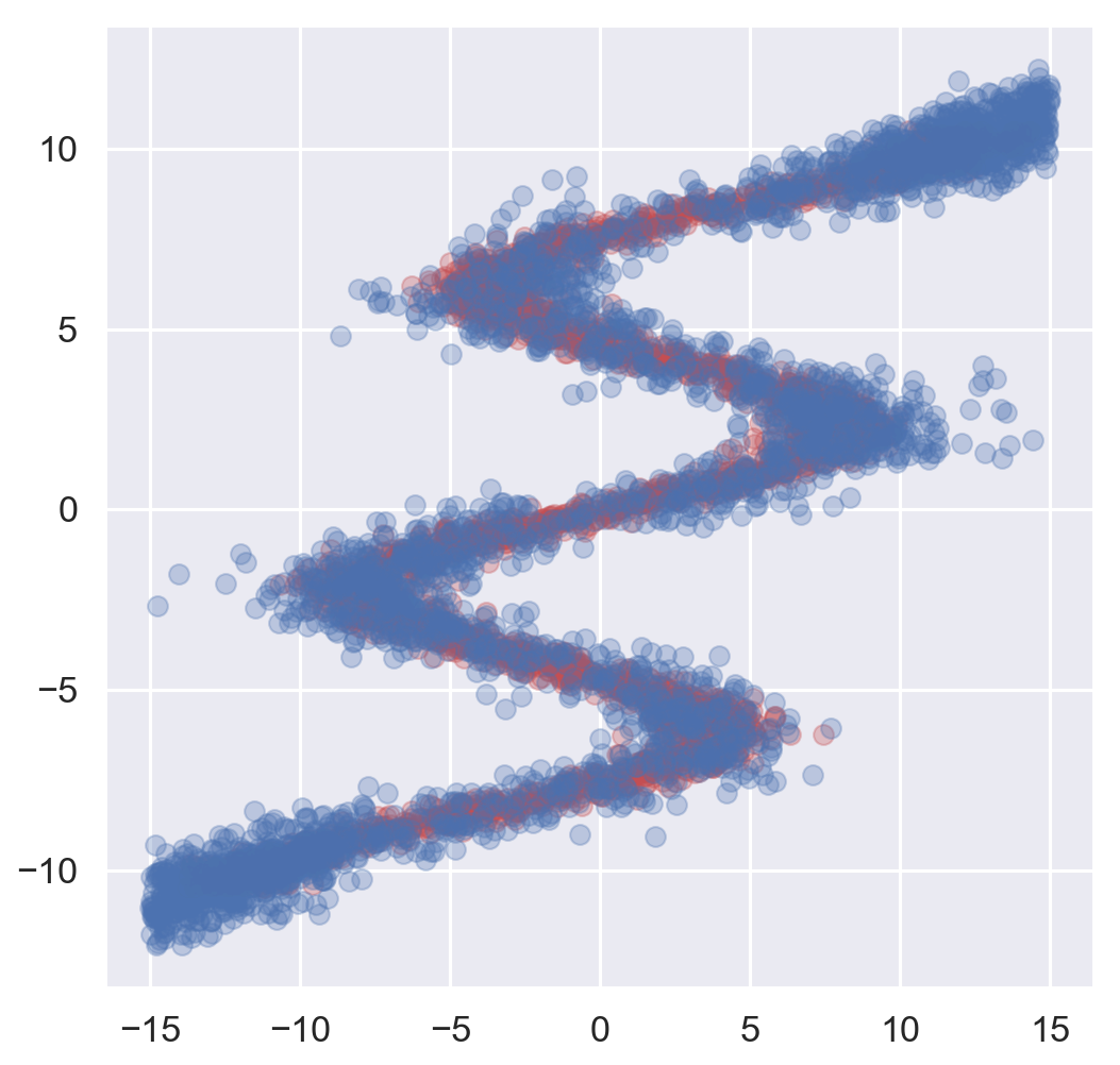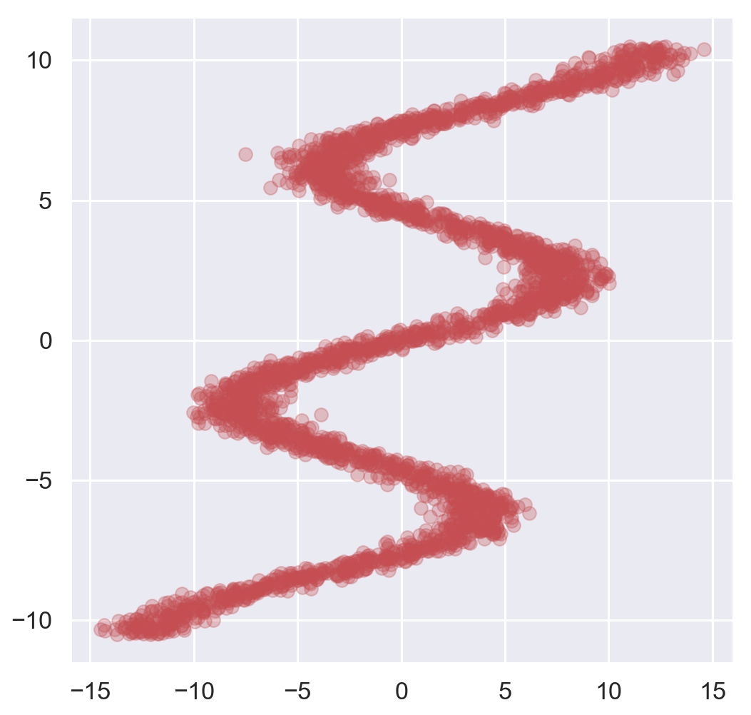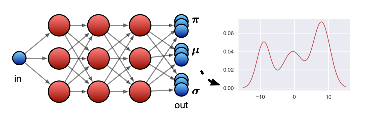\(\mathcal{L}\) measures likelihood of \(t\) being drawn from a mixture parametrised by \(\mu\), \(\sigma\), and \(\pi\) which are generated by the network inputs \(x\): \[\mathcal{L} = \sum_{i=1}^K\pi_i(\mathbf{x})\mathcal{N}\bigl(\mu_i(\mathbf{x}), \sigma_i^2(\mathbf{x}); \mathbf{t} \bigr)\]Two-hidden-layer MDN (510 parameters)---code snippet: