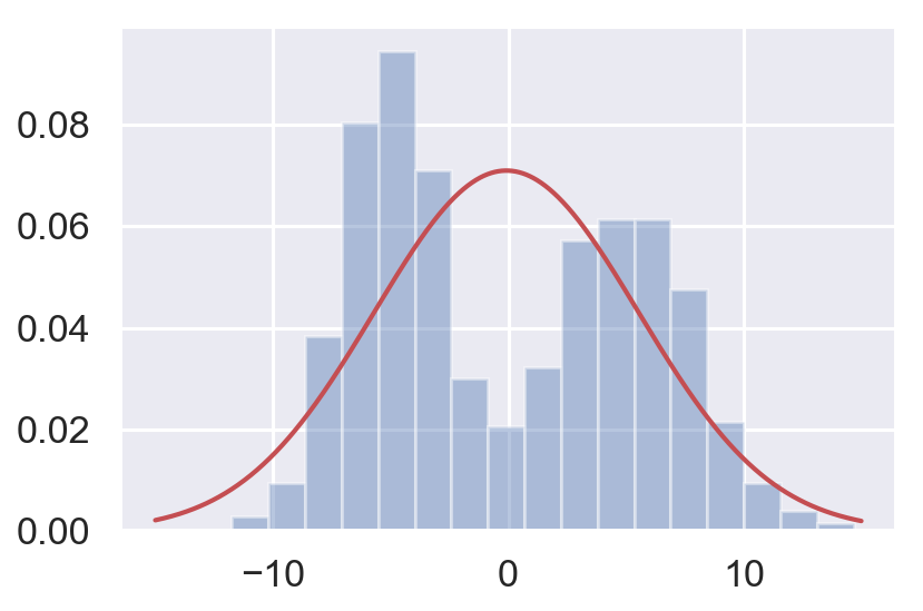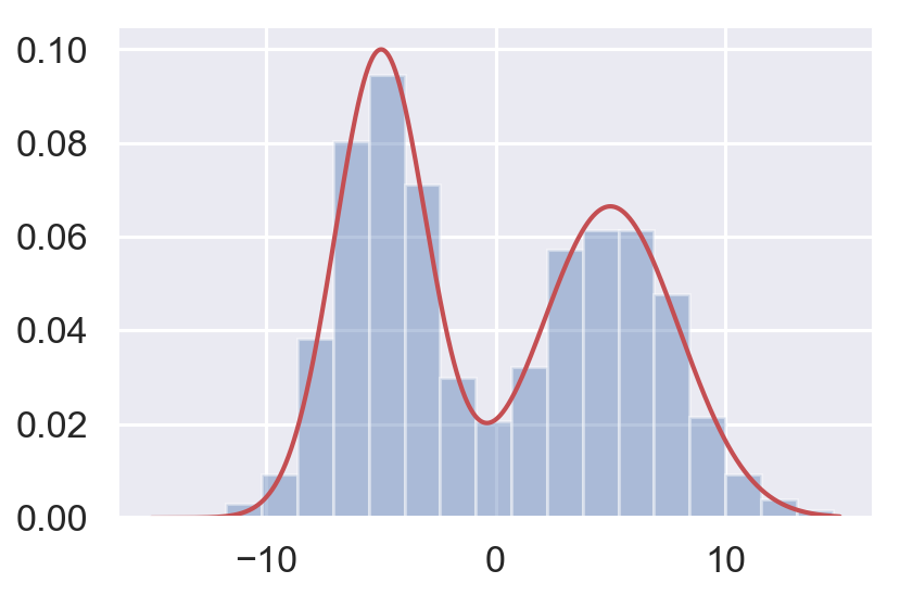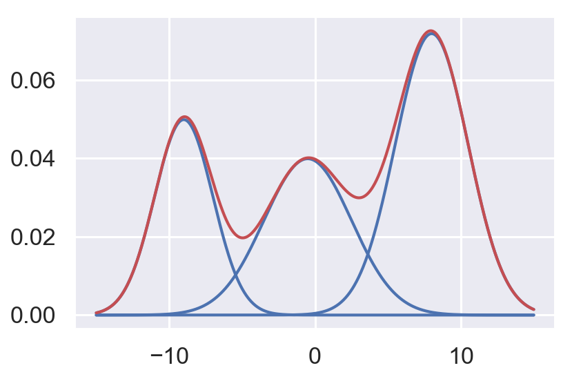 Returning to our modelling problem, let’s plot the PDF of a evenly-weighted mixture of the two sample normal models.